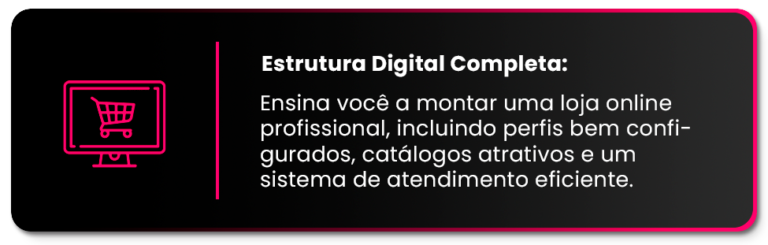 Seu perfil será uma vitrine irresistível, com catálogo organizado e estratégias que transformam seguidores em clientes fiéis. Você aprenderá a destacar sua marca e vender todos os dias, sem depender de sorte ou indicação.